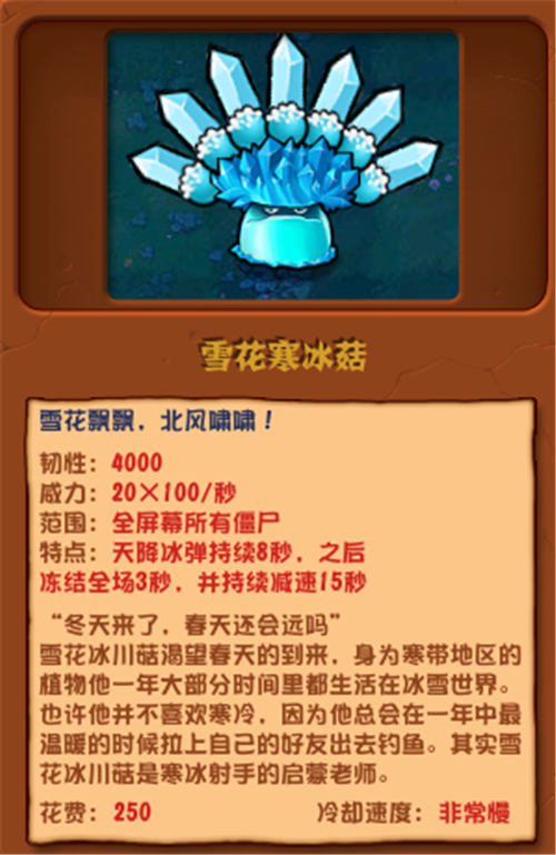 - 雪花寒冰菇:8秒后冻结全场3秒,僵尸多的时候用。