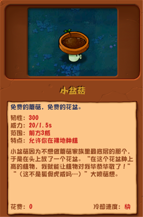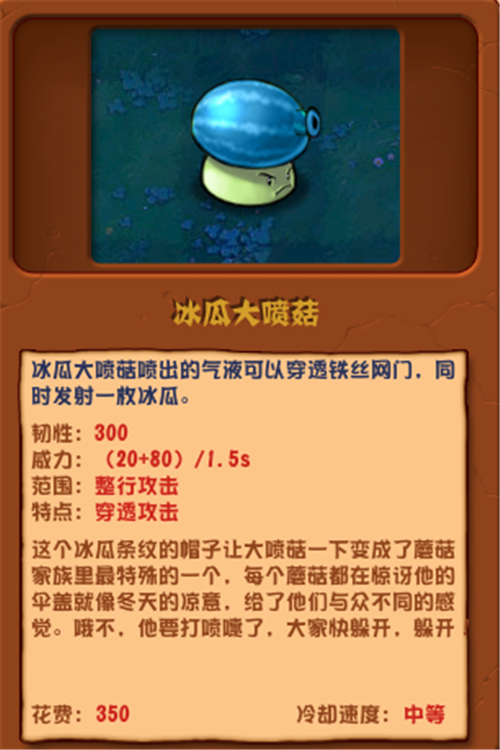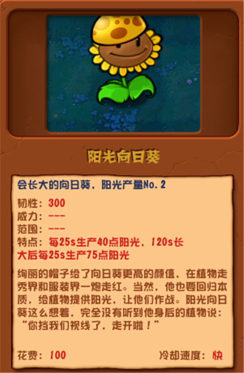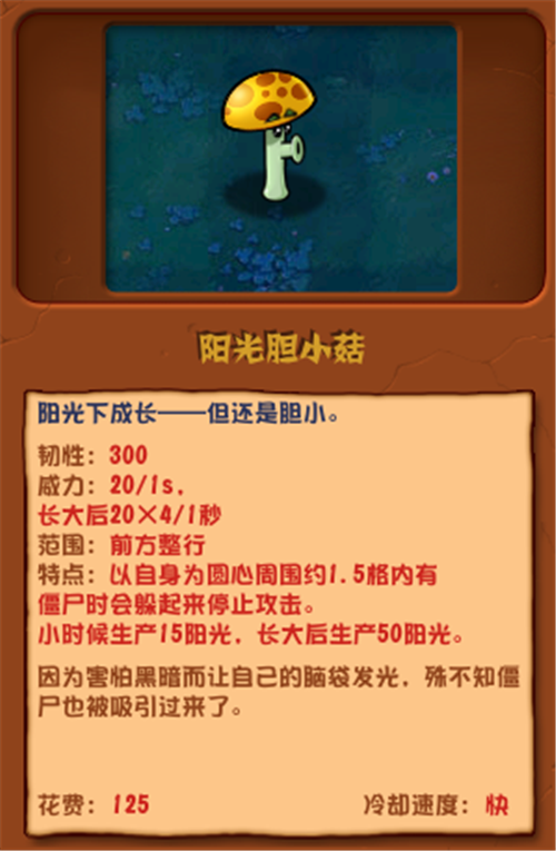 - 阳光胆小菇:第8关奖励,冷却快还阳光,前期保护单路。