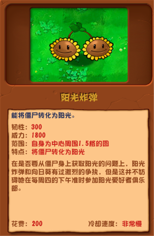 - 阳光炸弹:樱桃炸弹和向日葵的结合,清场效果好。