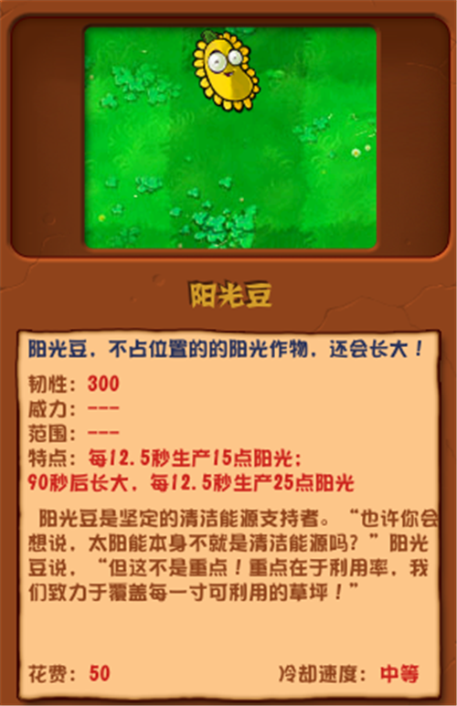 - 阳光豆:不占格子,和阳光向日葵一起用阳光多。