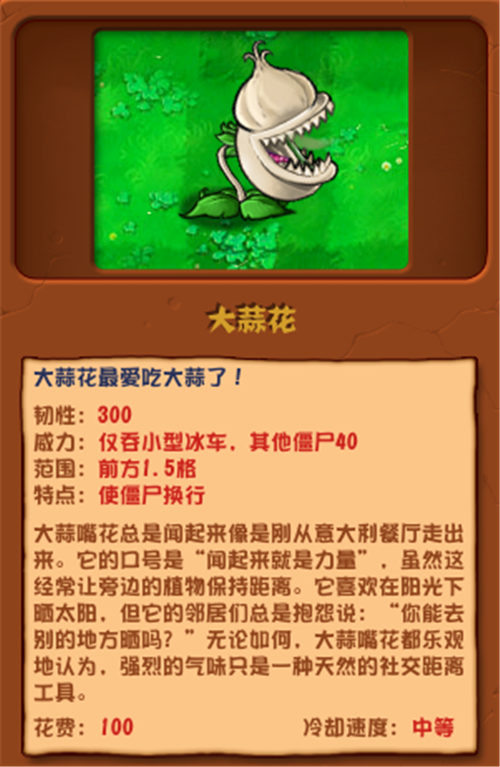 - 大蒜花:对付冰车僵尸,换行时要注意布局。