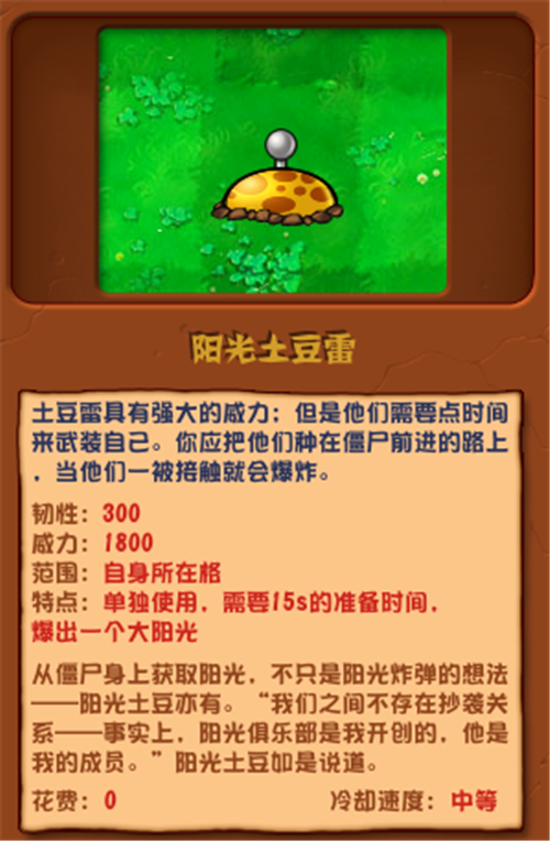- 阳光土豆雷:零成本炸僵尸,但对钢盔僵尸没用。